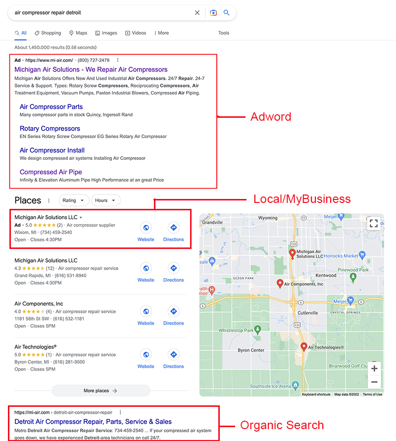 On this search results page below you can see our client holds the #1 position in all three areas—Adwords, Local/MyBusiness, and Organic Search.