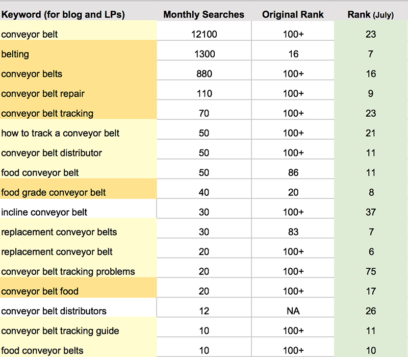 This excerpt from a target keyword list shows the search volume, original ranking and current ranking for each keyword. Landing pages and blog articles that are optimized for a keyword phrase help increase search rankings—which in turn increase search traffic and leads.
